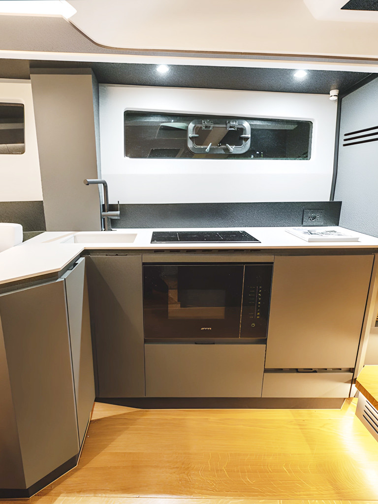 La cucina interna del Luxia 375 GTS è dotata di una finestra panoramica e un mobile integrato con piano in Silestone. Include un lavello incorporato con miscelatore di design, piastra ad induzione a due fuochi, frigorifero da 49 litri, forno a microonde Smeg e sei cassetti per lo stoccaggio