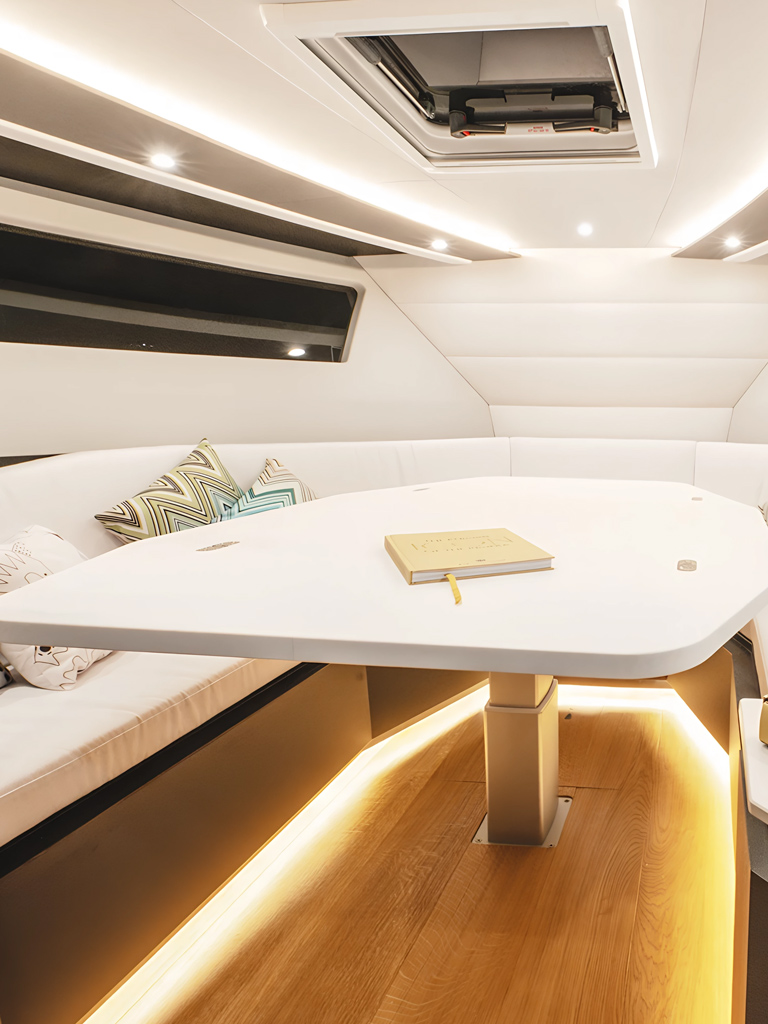 Le sedute del Luxia 375 GTS sono realizzate con tessuti Linetex® o Batyline®, resistenti a macchie, acqua, raggi UV, muffe e freddo, ideali per l’uso nautico. La cuscineria di prua è ampia e personalizzabile con diversi tessuti e imbottiture, offrendo massimo comfort sia in sosta che durante la navigazione